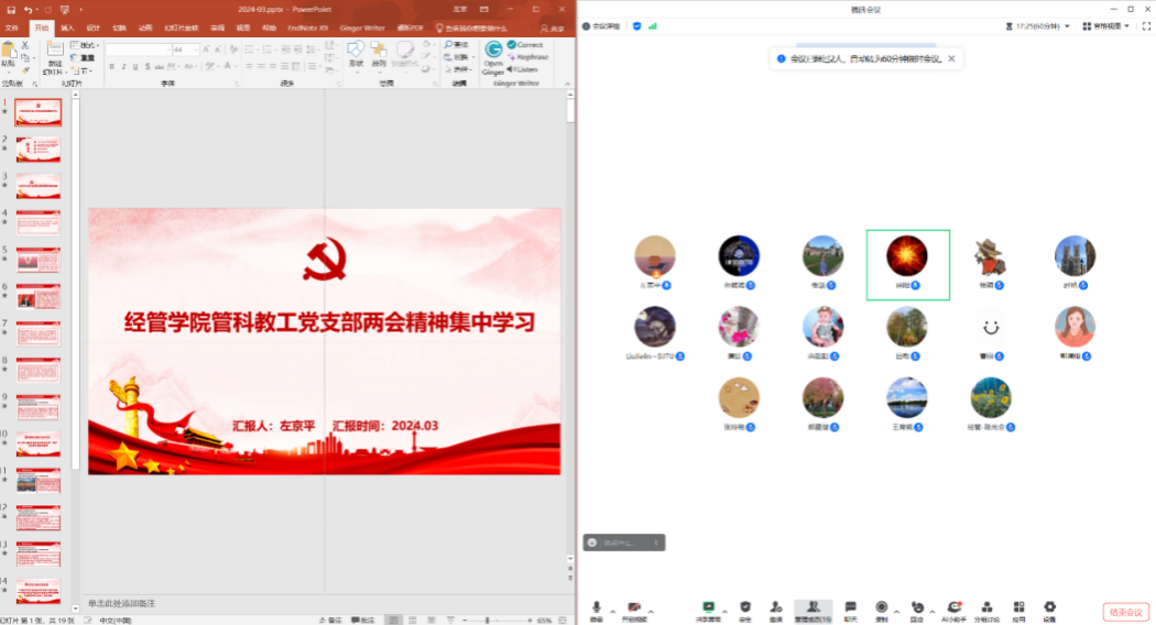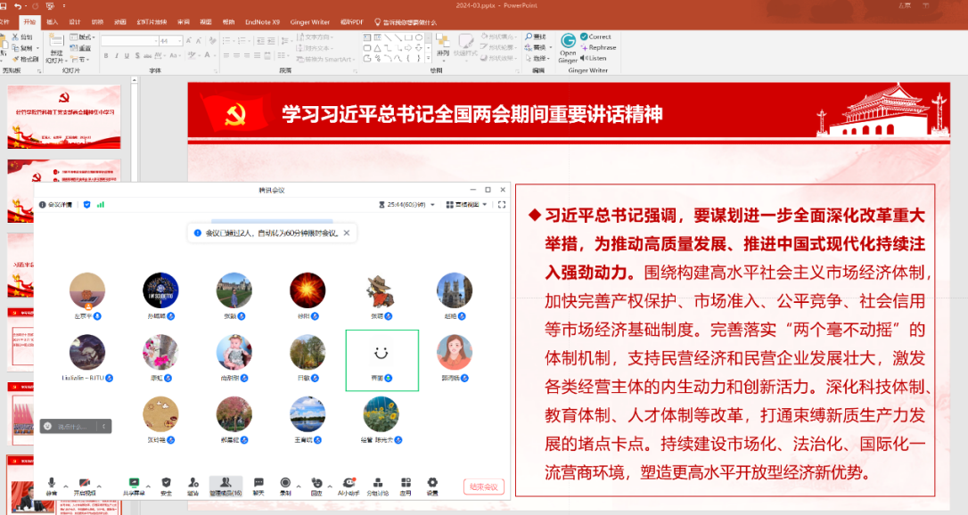 3月7日至3月20日,全體黨支部分別開展了支部集中學習研討會,學習宣傳貫徹全國兩會精神。支部黨員還結(jié)合自身實際,圍繞對兩會高頻詞的理解、學生黨員應(yīng)該怎么做、新型生產(chǎn)力的發(fā)展與科研教學實踐緊密結(jié)合等主題,就如何將兩會精神轉(zhuǎn)化為推動工作發(fā)展的強大動力進行了深入討論,以實際行動踐行初心使命。支部書記要求黨員要切實將“兩會精神”轉(zhuǎn)化為砥礪奮斗的思想源泉和行動力量,對全國兩會重要精神要再次進行自學。