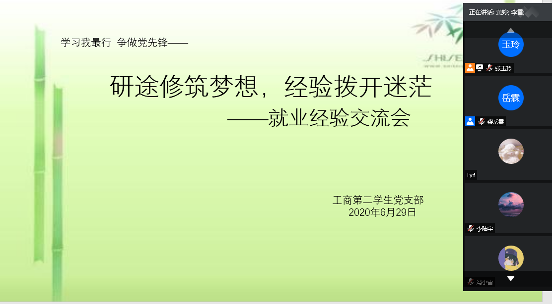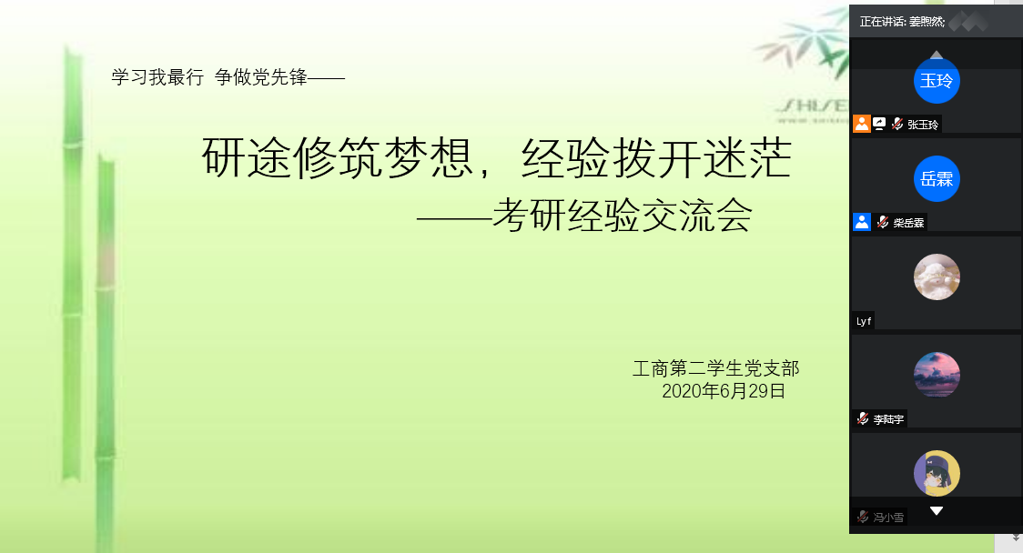 6月29日,工商第二學生黨支部開展了“學習我最行 爭做黨先鋒”特色黨日活動,本期活動的主題是“研途修筑夢想,經(jīng)驗撥開迷茫”考研和就業(yè)經(jīng)驗交流會。活動邀請了朱穎、姜煦然、黃婷、竇瑜彤四位畢業(yè)生黨員依次分享自己的考研和就業(yè)經(jīng)驗,活動由支部書記張玉玲主持,全體支部成員參加。