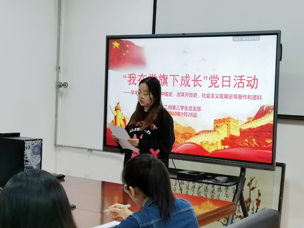 9月28日下午18:30,經(jīng)濟(jì)管理學(xué)院工商第三學(xué)生黨支部于教5-520開展了以“我在黨旗下成長(zhǎng)”為主題的黨日活動(dòng)。黨支部書記侯劍波、支部黨員及發(fā)展對(duì)象共22人參加此次活動(dòng),支部組織委員沈欣怡擔(dān)任主持人。