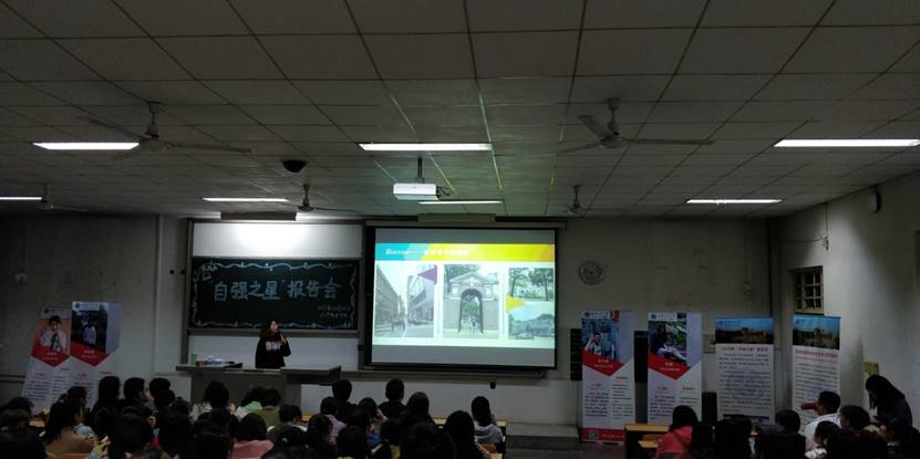 為宣傳在校大學(xué)生自強(qiáng)進(jìn)取,拼搏奮進(jìn)的典型事跡,在全校營造大學(xué)生自立自強(qiáng),健康成長的良好氛圍,由經(jīng)濟(jì)管理學(xué)院,文學(xué)院和體育學(xué)院聯(lián)合舉辦的“自強(qiáng)之星”報(bào)告會(huì)于2019年10月23日晚上19點(diǎn)在教1-201舉行。