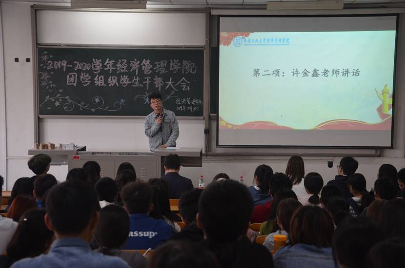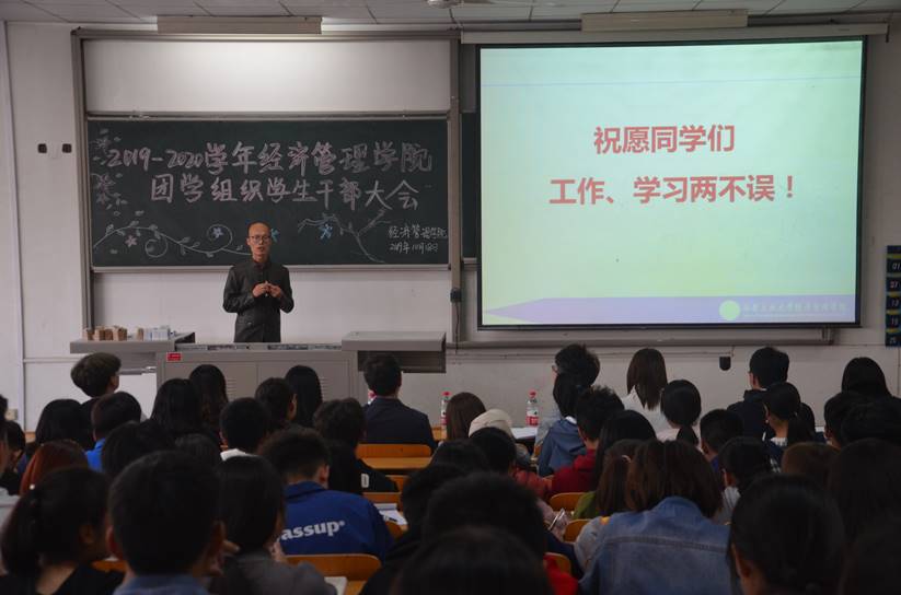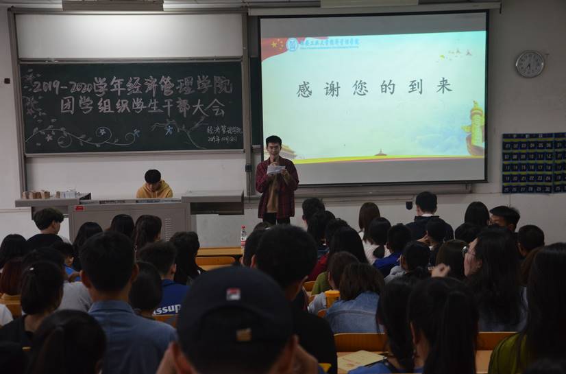 為全面推進(jìn)并貫徹落實(shí)學(xué)生工作精神,加強(qiáng)學(xué)院內(nèi)部了解,協(xié)調(diào)各方工作開展,經(jīng)濟(jì)管理學(xué)院于10月18日下午16:20在教1-201召開第一學(xué)期團(tuán)學(xué)組織學(xué)生干部大會(huì)。出席本次大會(huì)的嘉賓有:經(jīng)濟(jì)管理學(xué)院黨委副書記程新峰老師、團(tuán)委書記許金鑫老師、社團(tuán)管理中心指導(dǎo)老師劉雷波以及團(tuán)學(xué)組織主席團(tuán)。共二百余名學(xué)生干部參與此次大會(huì),辦公室干事雷仕軒擔(dān)任本次大會(huì)的主持人。