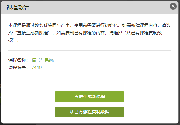 進(jìn)入到自己的教學(xué)空間后,篩選學(xué)期,找到本學(xué)期要上的課程進(jìn)行激活,此課程是從教務(wù)系統(tǒng)對(duì)接過(guò)來(lái),學(xué)生信息已經(jīng)導(dǎo)入。老師只需激活課程即可,老師在激活課程時(shí)如果之前已有建好的網(wǎng)絡(luò)課程可選擇“從已有課程復(fù)制數(shù)據(jù)”,如果之前未建過(guò)課,點(diǎn)擊“直接生成新課程”,此時(shí)課程已經(jīng)創(chuàng)建完成。