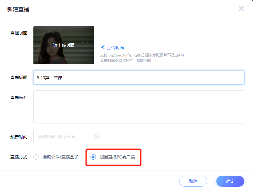 直播方式選擇“超星直播pc客戶端”,然后確定。
