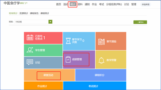 課程統(tǒng)計(jì)模塊:可從活動(dòng)管理導(dǎo)出簽到詳情,可在成績(jī)管理設(shè)置成績(jī)權(quán)重詳情并導(dǎo)出成績(jī)。
