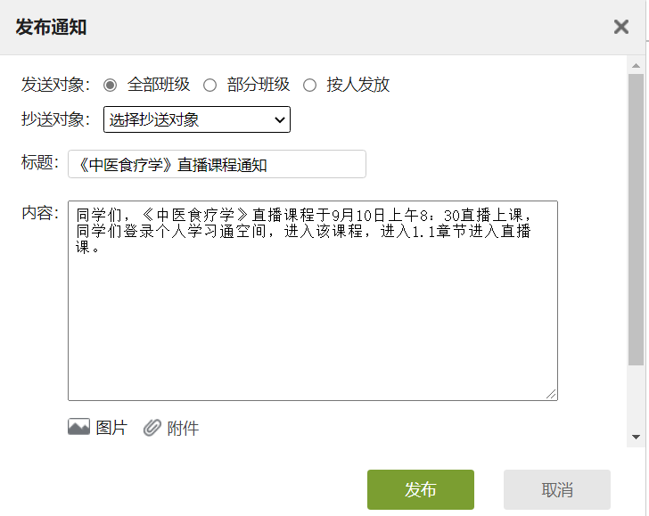 老師進(jìn)入到課程中,發(fā)布通知給學(xué)生,通知學(xué)生上課時(shí)間,方式等信息。
