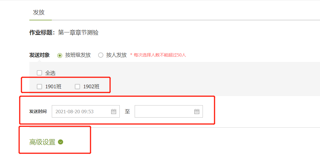 進(jìn)入作業(yè)模塊,創(chuàng)建作業(yè),發(fā)布作業(yè),對于已經(jīng)建好作業(yè)庫的老師,可從作業(yè)庫中直接選擇作業(yè)發(fā)布,發(fā)布時注意選擇發(fā)布對象,設(shè)置好作業(yè)時間以及其他高級設(shè)置部分。