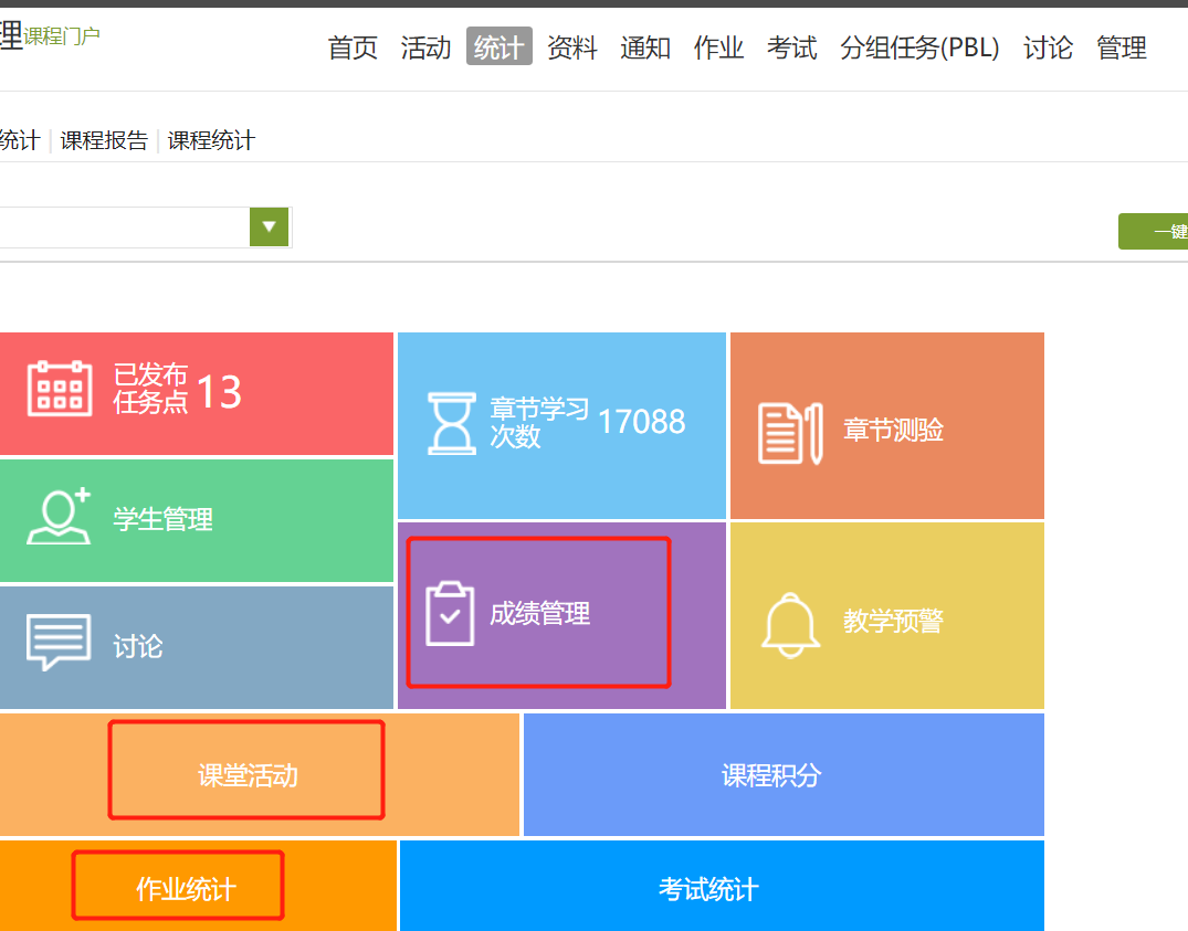 在課程界面,點(diǎn)擊進(jìn)入“統(tǒng)計”界面,分別進(jìn)入“課堂活動”模塊/“作業(yè)統(tǒng)計”模塊,查看對應(yīng)統(tǒng)計詳情,進(jìn)入“成績管理”模塊,查看各項活動的成績詳情。