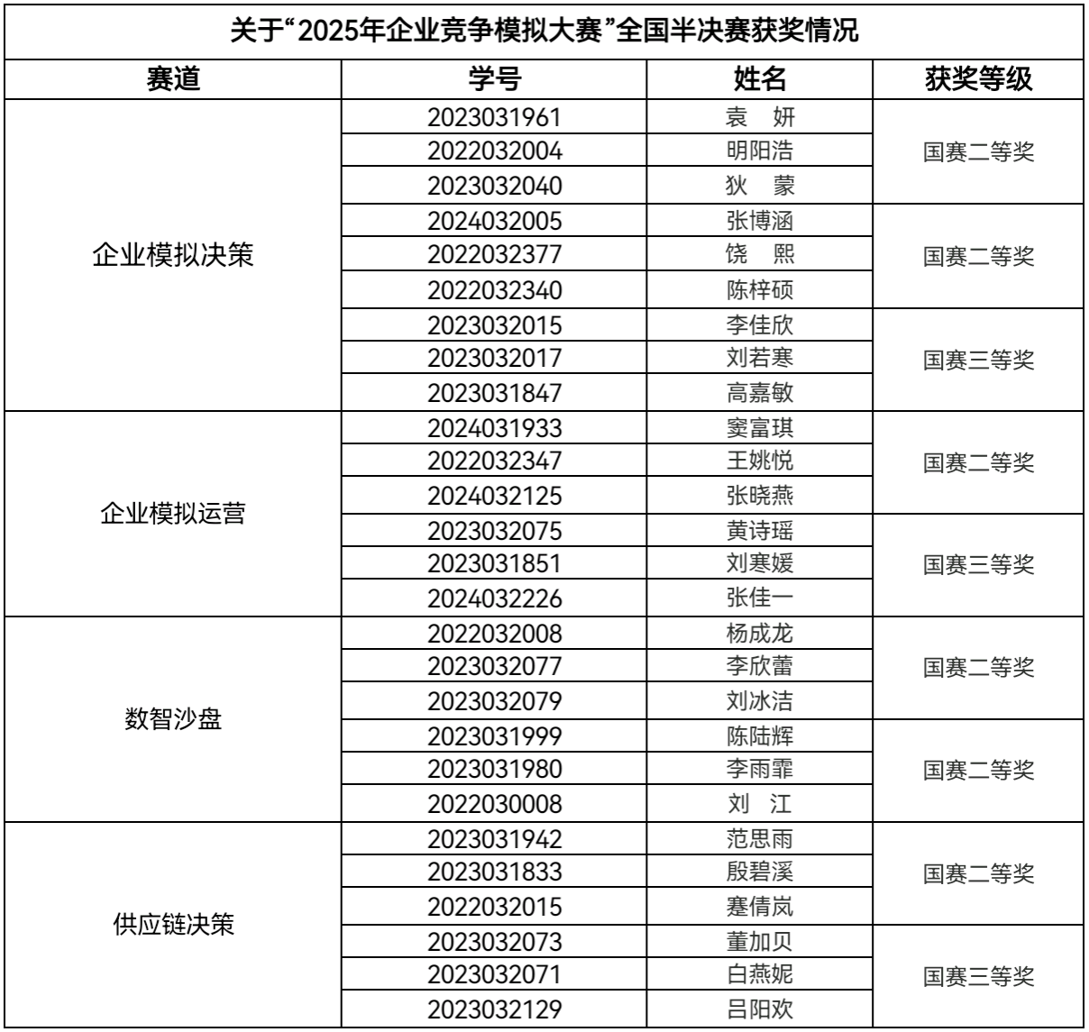 2025年4月25日—5月17日,由中國(guó)管理現(xiàn)代化研究會(huì)決策模擬專(zhuān)業(yè)委員會(huì)主辦的2025年全國(guó)企業(yè)競(jìng)爭(zhēng)模擬大賽圓滿結(jié)束。大賽自啟動(dòng)以來(lái),共有688所高校的近5萬(wàn)名師生報(bào)名參加,經(jīng)過(guò)激烈角逐,我校共獲得全國(guó)二等獎(jiǎng)6項(xiàng)、三等獎(jiǎng)3項(xiàng),充分展現(xiàn)了我校在“產(chǎn)教學(xué)研創(chuàng)賽”融合六位一體協(xié)同創(chuàng)新人才培養(yǎng)模式探索與實(shí)踐中的突出成果。